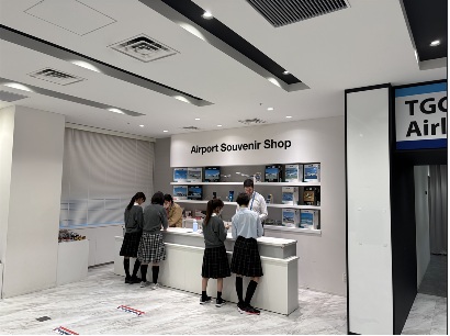「英語だけで過ごす」1日を体験するTGG研修では、空港・ホテル・カフェなど、海外を模したリアルな環境で、買い物や注文、旅行の相談などをすべて英語で挑戦しました。
